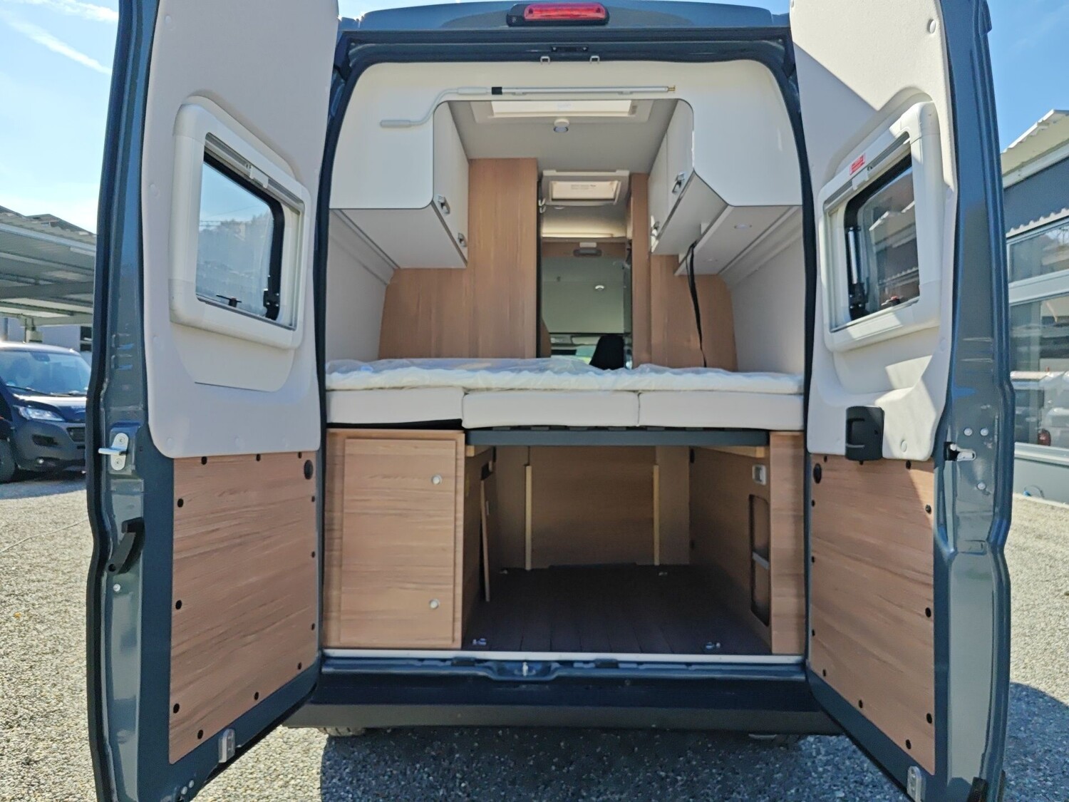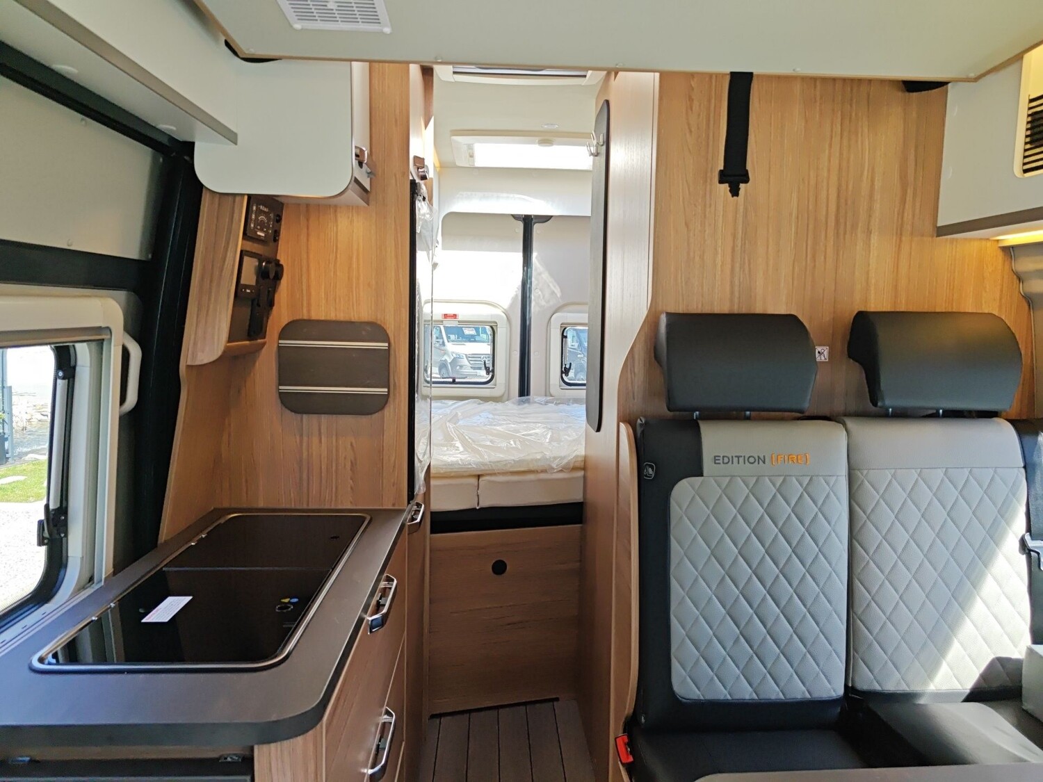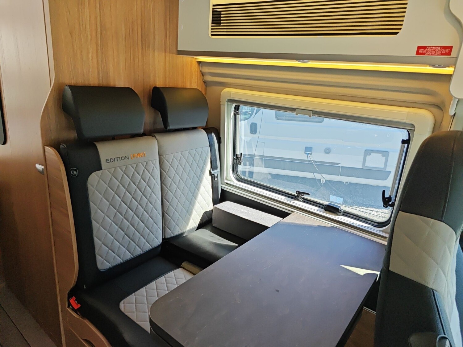• TÜV und Zulassungspapier, Küchenarbeitsplatte mit abklappbarer Verlängerung und 2 Taschenhalter, Tisch ausdrehbar, einzeln (ohne Gästebett), Kombi-Rollos mit Insektenschutz und Verdunkelung an Heckflügeltüren, Matratzentopper, Leseleuchten im Fahrerhaus,