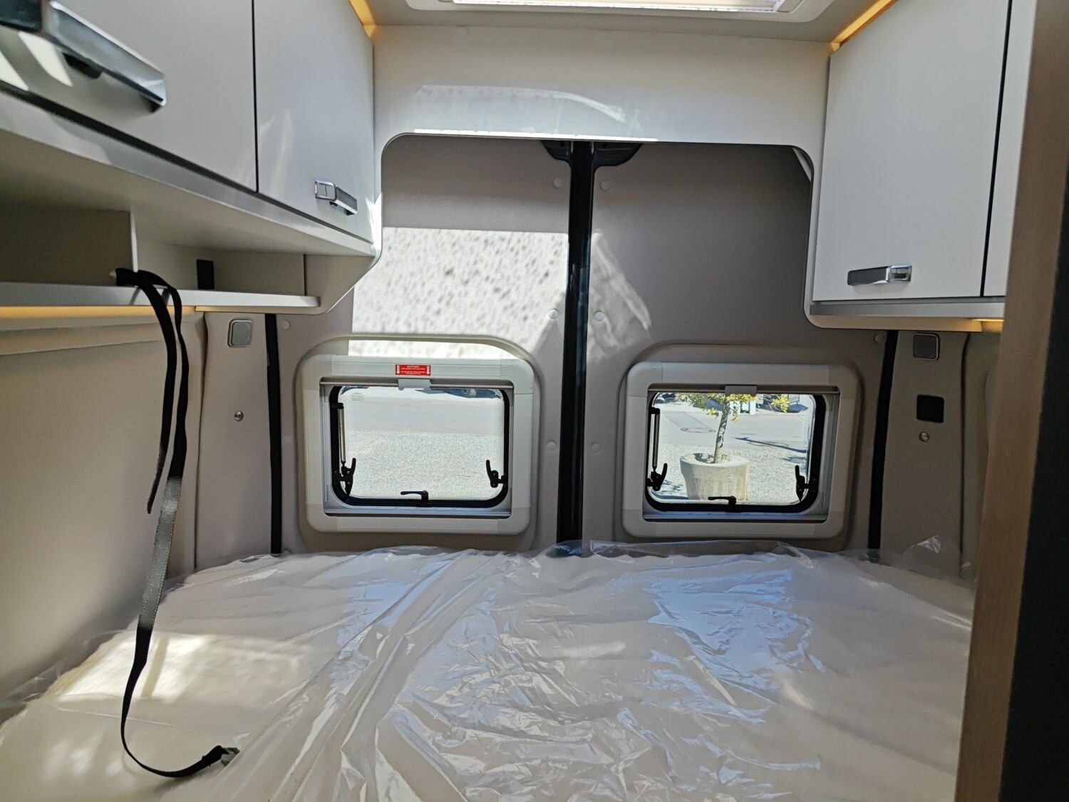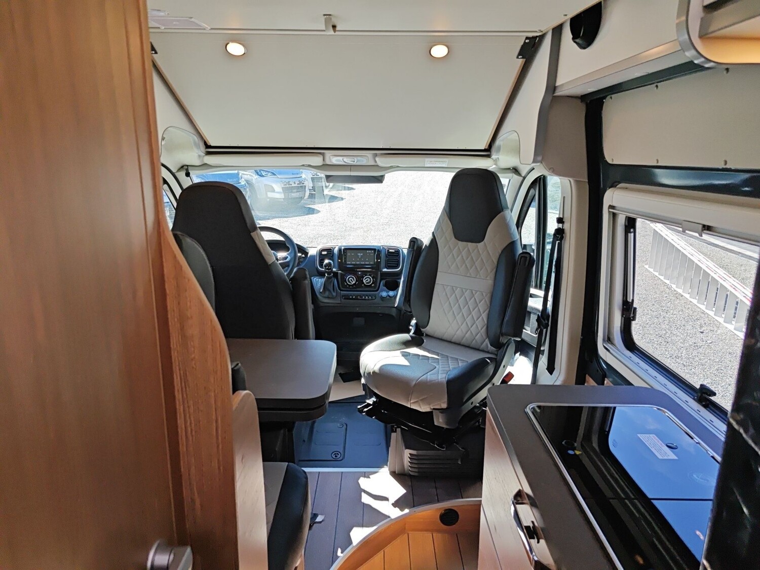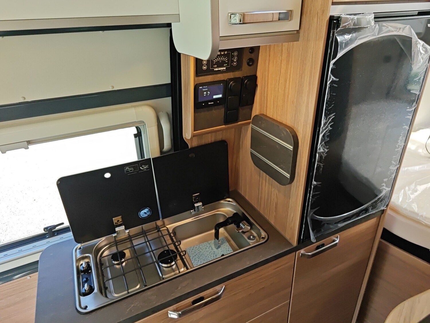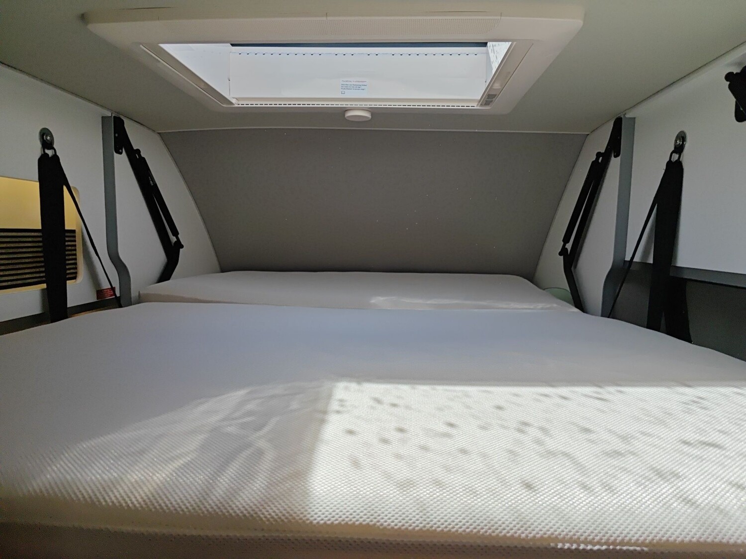 • TÜV und Zulassungspapier, Küchenarbeitsplatte mit abklappbarer Verlängerung und 2 Taschenhalter, Tisch ausdrehbar, einzeln (ohne Gästebett), Kombi-Rollos mit Insektenschutz und Verdunkelung an Heckflügeltüren, Matratzentopper, Leseleuchten im Fahrerhaus,
